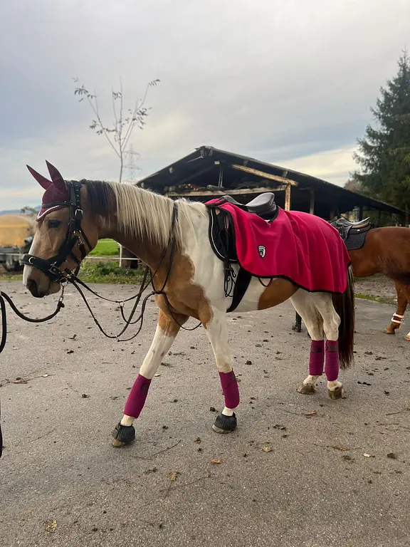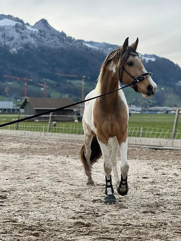 Er wird momentan angeritten. Er wird longiert und geht bereits als Handpferd ins Gelände. Auch kennt er bereits den Reiter auf dem Rücken.