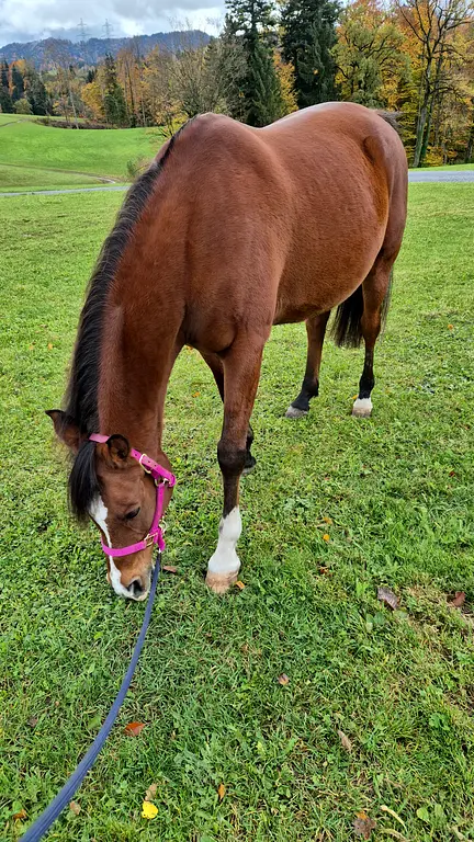 Wir suchen eine pferdeerfahrene Unterstützung für unseren Vollblutaraber Wallach Eterno. Er erlitt im Mai 2025 einen Sehnenschaden und ist nun im Aufbau. Da wir nicht wissen, wann er wieder reitbar wird, suchen wir momentan eine Pflege/Spazierbeteiligung. Wenn er gesundheitlich wieder genug fit fürs Reiten wird, darf man da gerne dabei bleiben (ebenfalls kostenlos). Er ist ein sehr lieber und gutmütiger Kerl, der aber klare Grenzen braucht. Durch seine Verletzung leidet er unter Bewegungsmangel, daher braucht er eine einfühlsame und konsequente Hand. Eterno benötigt täglich geführte Bewegung und darf noch nicht im Offenstall mitlaufen. Da ich frisch Mama geworden bin und meine Schwester nun jobbedingt oft im Ausland ist, wären wir sehr dankbar um 3x/Woche Unterstützung. Wir wünschen uns jemand, der bereits Erfahrung mit gesunderhaltendem Arbeiten, gymnastizieren und Bodenarbeit hat oder da gerne dazu lernen möchte. Eterno ist ein sehr sensibles Pferdchen und braucht die korrekte Hilfe und Handhabung, um gesund zu werden/zu bleiben.