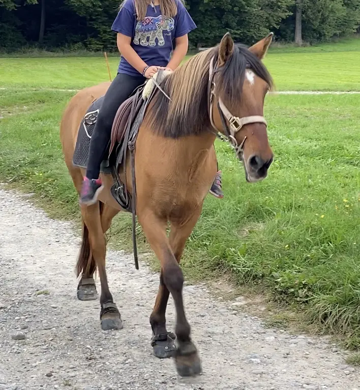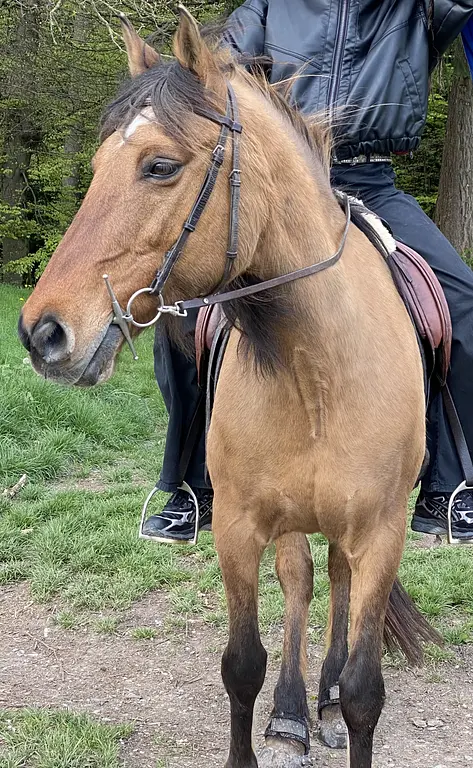 Xiahe ist 1.44m gross, sehr angenehm zu reiten und unkompliziert im Umgang.