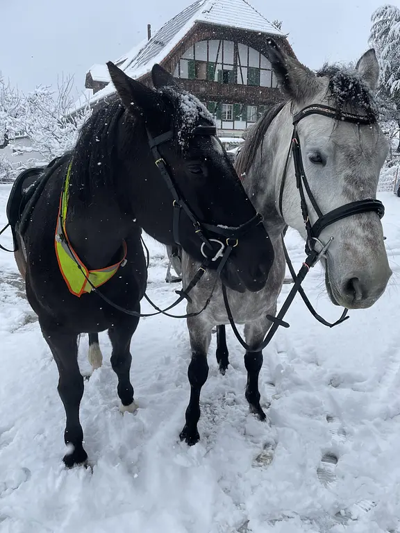 Wichtig: Wir sind beide brav – wir bocken nicht, wir beissen nicht. Trotzdem suchen wir jemanden mit Pferdeverstand, der Freude am Ausreiten hat und sich mit uns wohlfühlt.