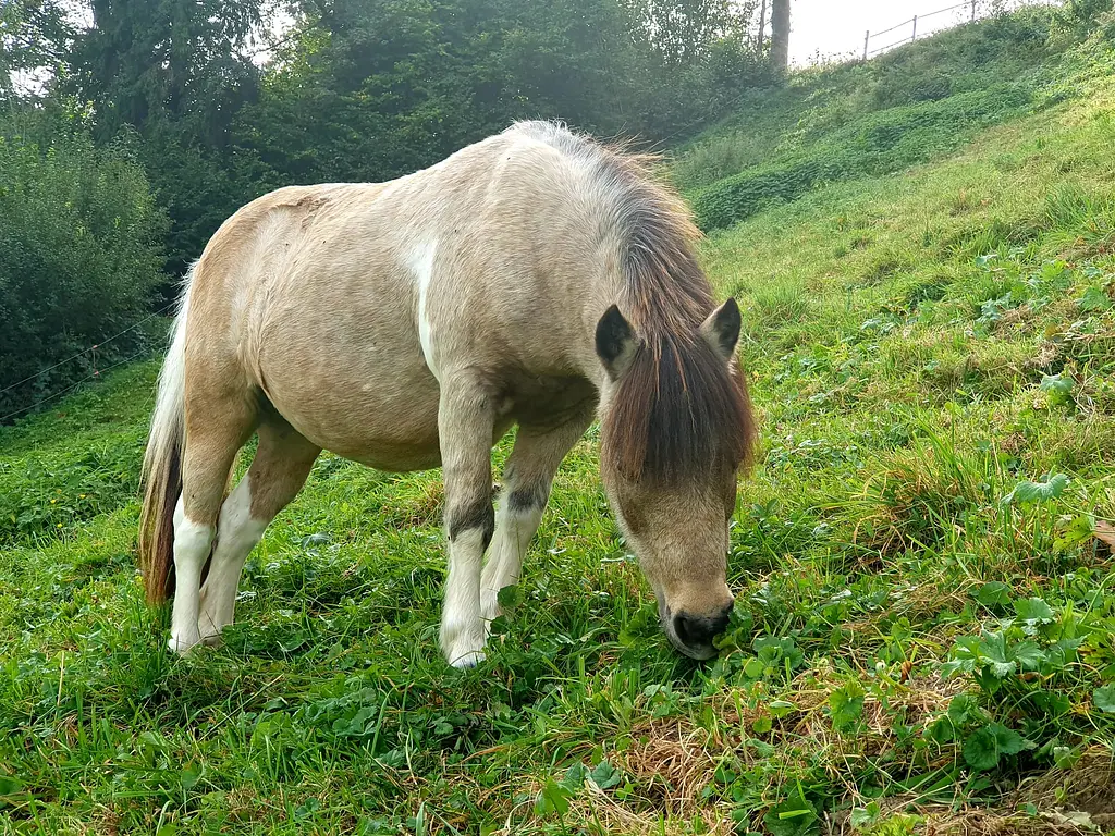 Hopi ist sehr freundlich, treu und ruhig. Sie ist für jeden Spass zu haben, solange sie der Person vertrauen kann. Sie ist 90cm gross, sehr kinderlieb, man kann mit ihr über Stock und Stein, jump und run machen, aber auch Bodenarbeit macht sie mit. Mit ihr steht ihr 2 jähriges Fohlen Mila die man auch nach Absprache gerne putzen darf.